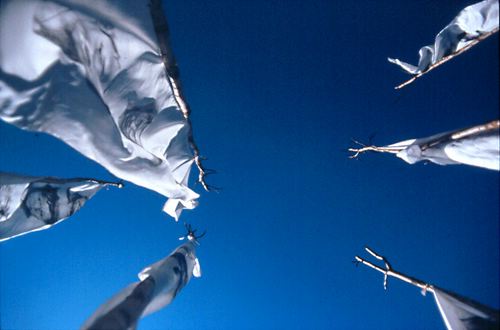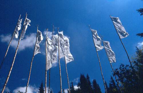„…wir glauben, eine ständige Auseinandersetzung mit den spirituellen Gegebenheiten unseres Lebensraumes sei unnötig, da in unserer Geschichte der kollektive Gedanke einer maßgeblichen Wildnis von der Struktur des materiellen Individualismus überprägt wurde. lungta (tibet.: „Windpferd“) – mythologisches Tierwesen der animistischen Bön-Tradition im Himalaya. Nimmt Gebete und Wünsche in Form wehender Stofffahnen auf und transportiert sie galoppierend durch die Wolken |